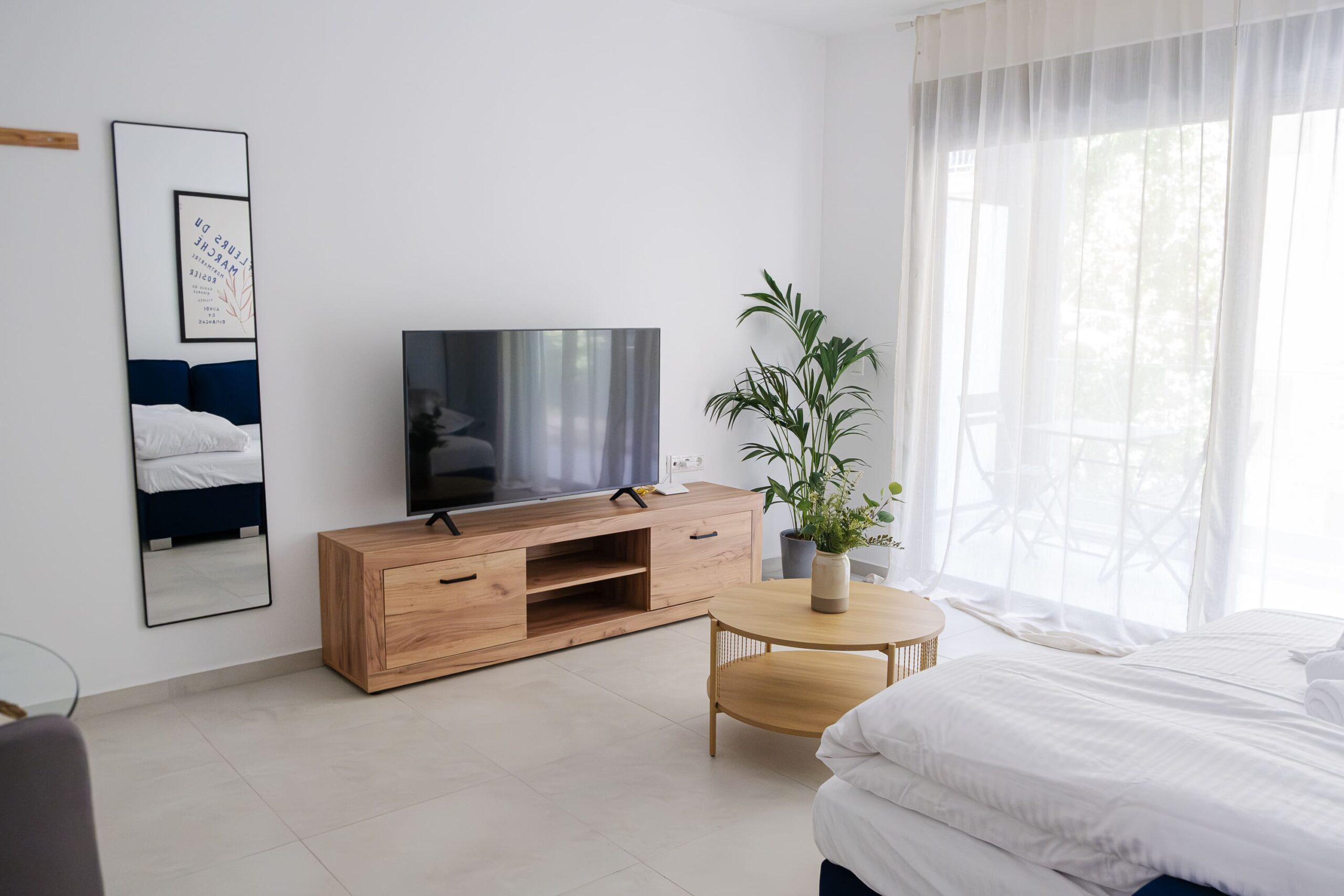 Stay effortlessly connected and entertained throughout your visit in our fully furnished deluxe room. Enjoy high-speed internet access, a flat screen TV, and smart features that support both work and relaxation. Whether you’re catching up on emails or unwinding with your favorite shows, everything is ready for you in this Athens smart accommodation with self check-in — designed for comfort, independence, and modern convenience.